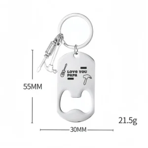 Expertly crafted from polished stainless steel, this keychain is built to last. Measuring 55mm × 30mm and weighing 21.5g, it’s both lightweight and solid. Not only does it look great, but it’s also resistant to rust and wear. The front features a bold engraved message—“LOVE YOU PAPA”—accompanied by simple tool icons, symbolizing your dad’s hardworking spirit.