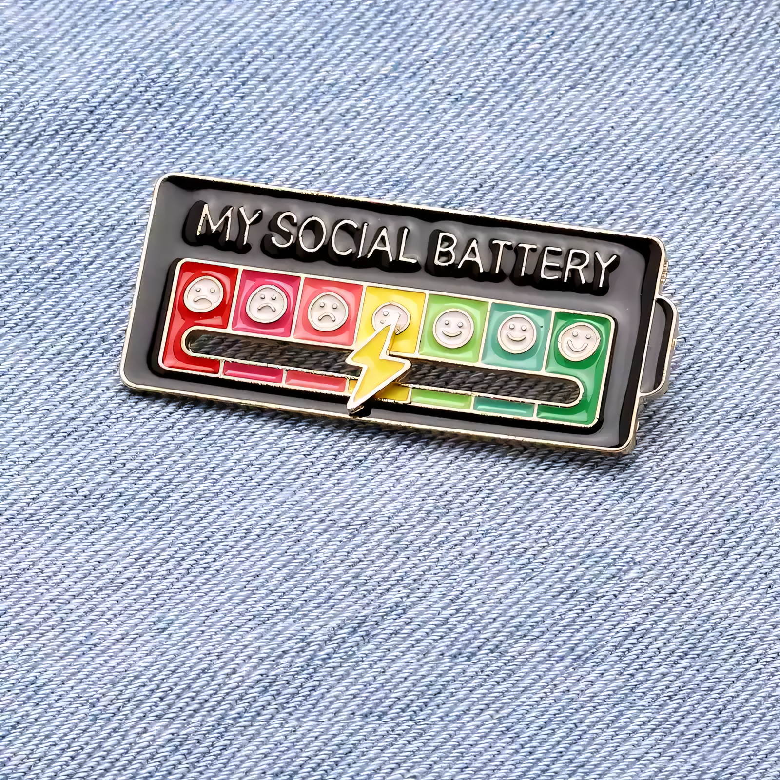 The pin features a playful design with emoticons on a battery meter. The faces range from sad to happy, representing how we feel in different social situations. The text “MY SOCIAL BATTERY” adds a humorous touch, making it both witty and fun. -